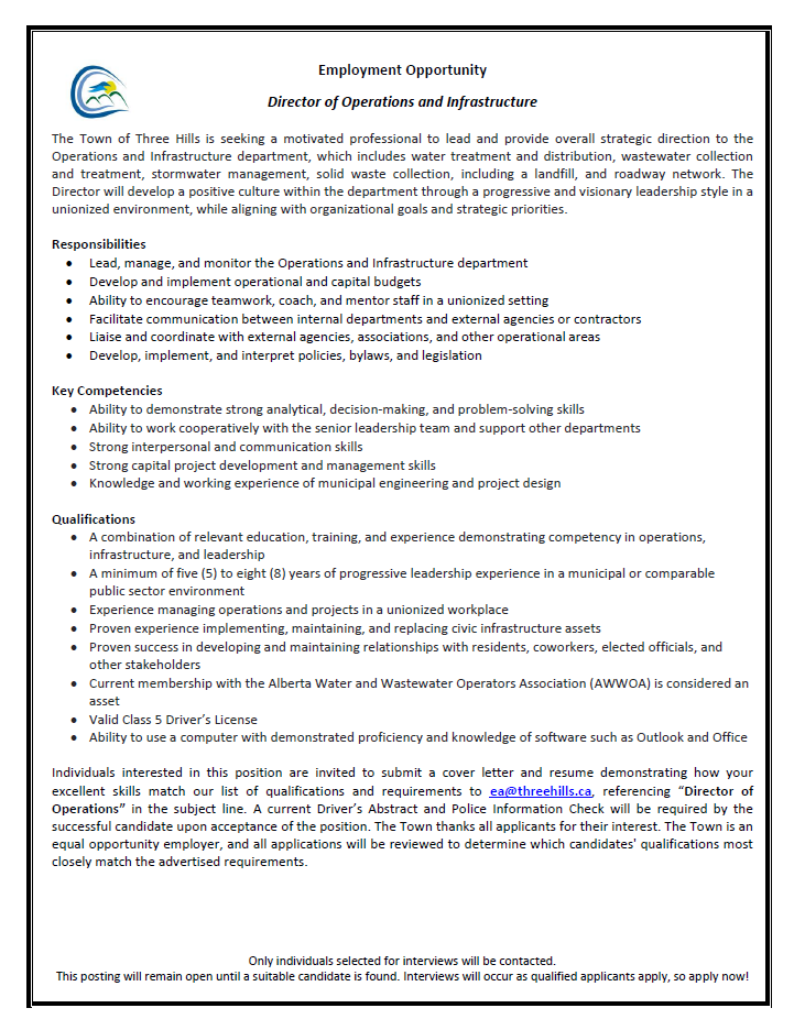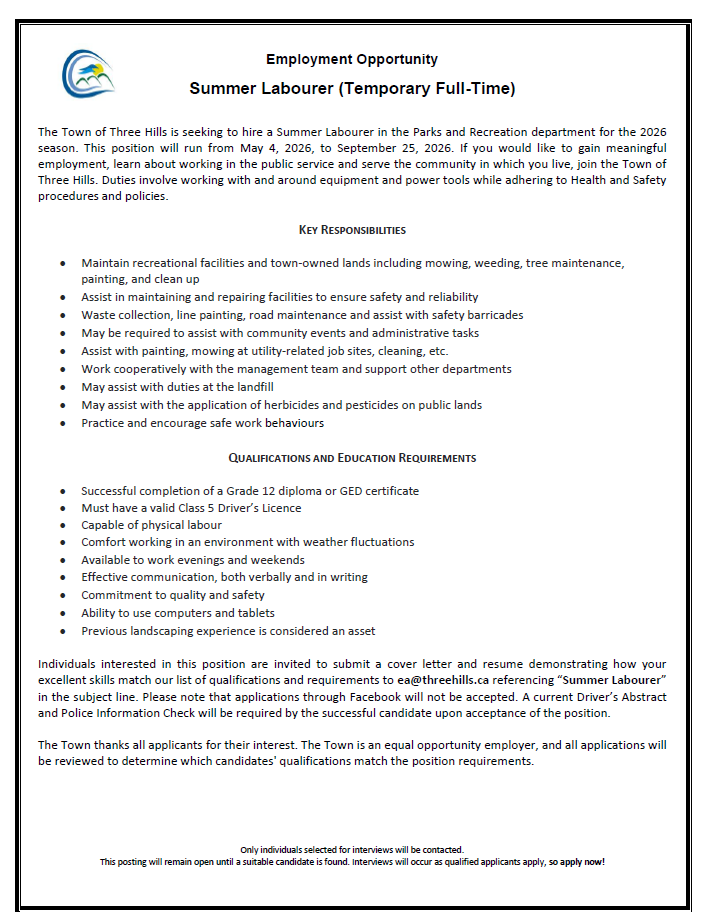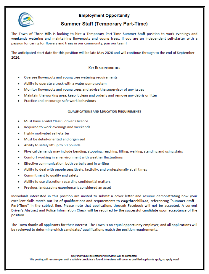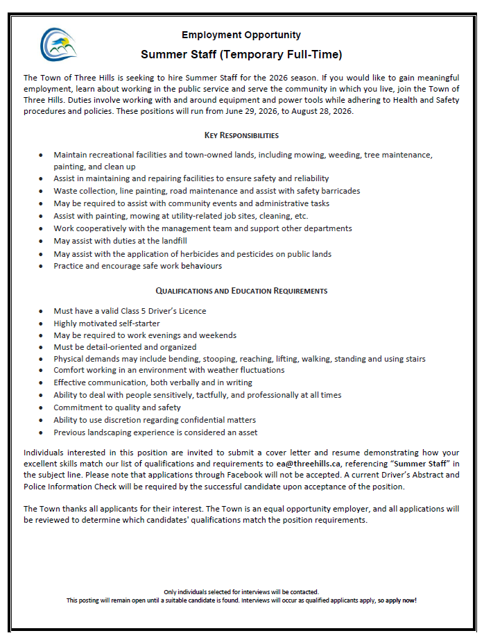 The Town of Three Hills offers diverse and rewarding career opportunities for everyone - from individuals beginning their careers to those with significant experience.